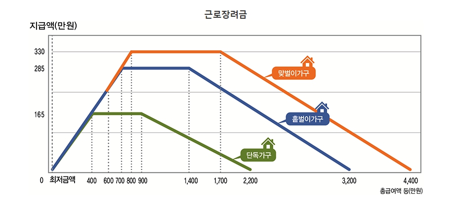 일은 하지만 소득이 적어 생활이 어려운 근로자, 개인사업자, 종교인 소득자에게 정부가 현금으로 지원하는 제도입니다. 가구의 소득 수준과 재산 요건을 충족하면 신청할 수 있으며, 가구 유형에 따라 최대 330만 원까지 지급됩니다.